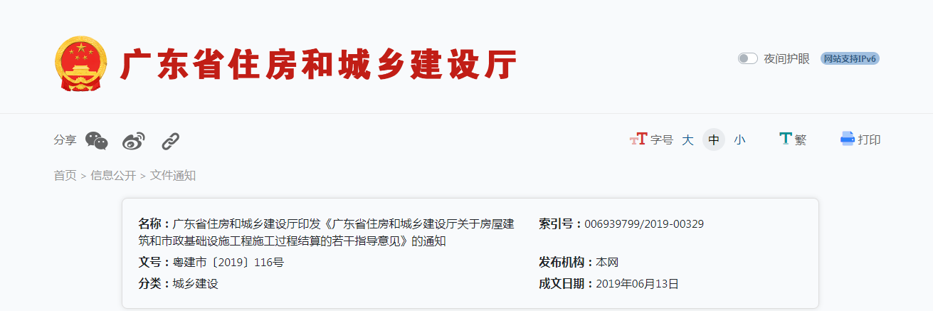 2019年6月13日,廣東省住建廳印發通知,推進全省房屋建筑和市政基礎設施工程施工過程結算。