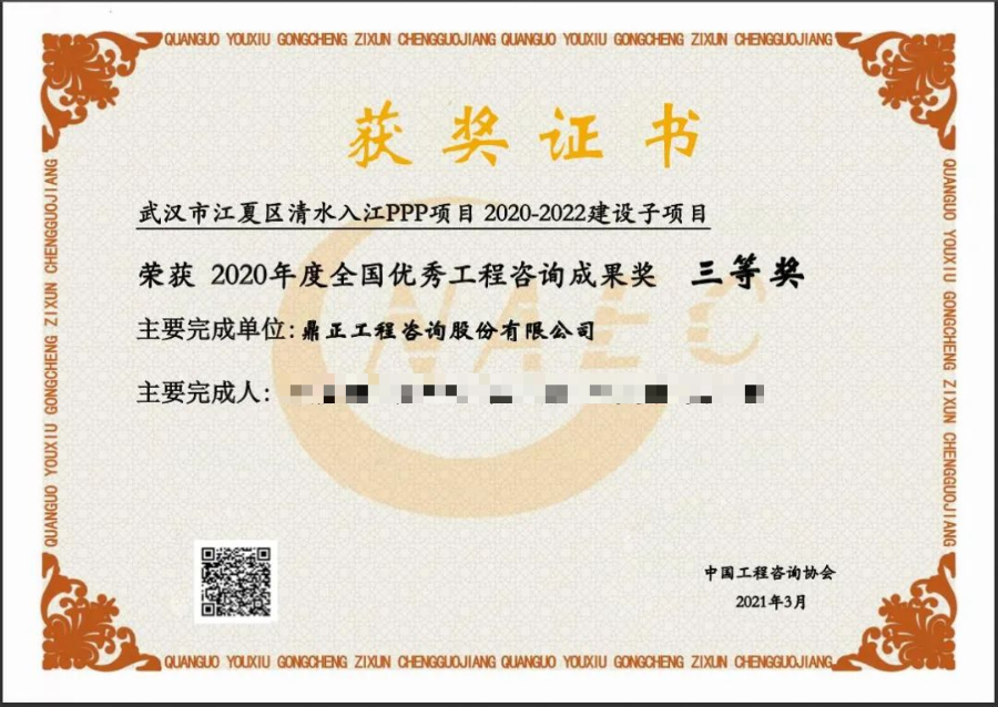 2021年3月5日,中國工程咨詢協會公布了“2020年度全國優秀工程咨詢成果獎”獲獎項目名單,鼎正咨詢繼2019年全咨項目榮獲全國優秀工程咨詢成果獎后,又一PPP咨詢項目——由鼎正咨詢獨立編制完成的“武漢市江夏區清水入江PPP項目 2020-2022建設子項目”實施方案再度榮獲全國優秀工程咨詢成果三等獎!