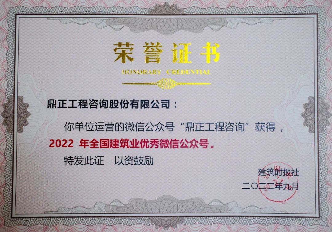 9月25-26日,由建筑時報社主辦的2022建筑業(yè)微信公眾號運(yùn)維經(jīng)驗(yàn)交流研討會暨全國建筑業(yè)優(yōu)秀公眾號頒獎典禮在武漢舉辦。鼎正官方微信公眾號“鼎正工程咨詢”上榜全國建筑業(yè)優(yōu)秀微信公眾號榜單,榮獲2022年全國建筑業(yè)優(yōu)秀微信公眾號。