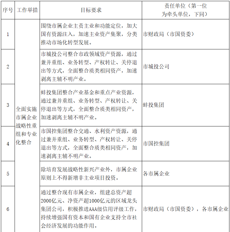 1.全面實施市屬企業(yè)戰(zhàn)略性重組和專業(yè)化整合。圍繞市屬企業(yè)主責主業(yè)和功能定位,加大國有資源注入,加速主業(yè)資產(chǎn)集聚,分類推動市場化轉(zhuǎn)型發(fā)展。市城投公司整合市政領(lǐng)域資產(chǎn)資源,蚌投集團整合產(chǎn)業(yè)基金和重點產(chǎn)業(yè)資源,市國控集團整合交通、水利資產(chǎn)資源,通過兼并重組、業(yè)務(wù)轉(zhuǎn)型、產(chǎn)權(quán)轉(zhuǎn)讓、關(guān)停退出等方式,全面整合質(zhì)類相同資產(chǎn),加速剝離主輔不明產(chǎn)業(yè)。除培育發(fā)展戰(zhàn)略性新興產(chǎn)業(yè)外,市屬企業(yè)原則上不得新增非主業(yè)項目投資。在此基礎(chǔ)上,通過整合現(xiàn)有市屬企業(yè),組建總資產(chǎn)超2000億元、凈資產(chǎn)超1000億元的區(qū)域龍頭集團公司,積極推進AAA級信用評級工作,持續(xù)增強國有資本和國有企業(yè)支持全市社會經(jīng)濟發(fā)展的功能作用。〔責任單位:市財政局(市國資委),各市屬企業(yè)〕