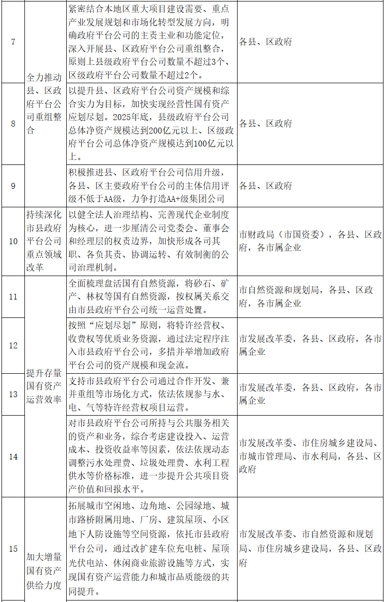 2.全力推動縣、區(qū)政府平臺公司重組整合。各縣、區(qū)政府(市高新區(qū)管委會、市經(jīng)開區(qū)管委會,下同)要緊密結(jié)合本地區(qū)重大項目建設(shè)需要、重點產(chǎn)業(yè)發(fā)展規(guī)劃和市場化轉(zhuǎn)型發(fā)展方向,明確政府平臺公司的主責主業(yè)和功能定位,深入開展縣、區(qū)政府平臺公司重組整合,充分發(fā)揮資源集聚優(yōu)勢。原則上縣級政府平臺公司數(shù)量不超過3個、區(qū)級政府平臺公司數(shù)量不超過2個。以提升縣、區(qū)政府平臺公司資產(chǎn)規(guī)模和綜合實力為目標,加快實現(xiàn)經(jīng)營性國有資產(chǎn)應(yīng)劃盡劃。2025年底,縣級政府平臺公司總體凈資產(chǎn)規(guī)模達到200億元以上、區(qū)級政府平臺公司總體凈資產(chǎn)規(guī)模達到100億元以上。積極推進縣、區(qū)政府平臺公司信用升級,各縣、區(qū)主要政府平臺公司的主體信用評級不低于AA級,力爭打造AA+級集團公司。(責任單位:各縣、區(qū)政府)