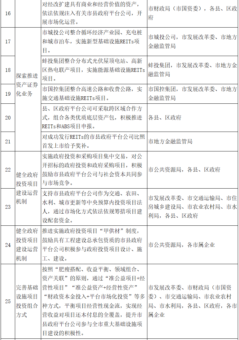 6.探索推進資產(chǎn)證券化業(yè)務(wù)。市城投公司整合循環(huán)經(jīng)濟產(chǎn)業(yè)園、充電樁和城市泊車,實施新型基礎(chǔ)設(shè)施REITs項目;蚌投集團整合分布式光伏屋頂電站、高新區(qū)熱電聯(lián)產(chǎn)項目,實施能源基礎(chǔ)設(shè)施REITs項目;市國控集團整合高速公路和收費公路,實施交通基礎(chǔ)設(shè)施REITs項目。縣、區(qū)政府平臺公司可采取跨區(qū)域合作方式,組合各類優(yōu)質(zhì)底層資產(chǎn)包,積極推進REITs和ABS項目申報。2025年底前,市屬企業(yè)力爭發(fā)行REITs不低于2支,募集資金規(guī)模不低于50億元。對成功發(fā)行REITs的市縣政府平臺公司比照首發(fā)上市給予獎補。(責任單位:市發(fā)展改革委、市地方金融監(jiān)管局、各縣、區(qū)政府,各市屬企業(yè))