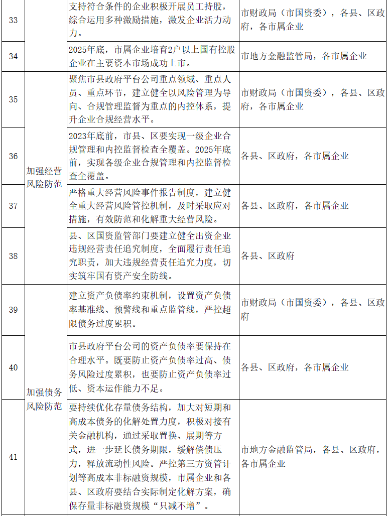 (五)切實加強風險防范。2025年底,市縣政府平臺公司實現(xiàn)對經(jīng)營、債務(wù)、擔保等全方位、全流程的風險管控,抗風險綜合能力進一步增強。企業(yè)合規(guī)管理和內(nèi)控監(jiān)督檢查實現(xiàn)全覆蓋,合規(guī)經(jīng)營水平切實提高。存量債務(wù)結(jié)構(gòu)趨于合理,債務(wù)期限和成本進一步優(yōu)化。對外擔保規(guī)模總體合理,擔保風險基本可控。政府隱性債務(wù)化解完成既定任務(wù)目標。