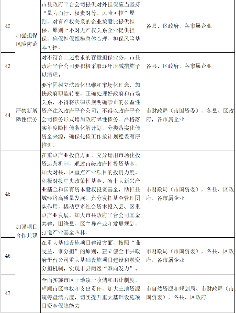 16.嚴禁新增隱性債務(wù)。要牢固樹立法治化思維和市場化理念,加快政府職能轉(zhuǎn)變,正確處理好政府和市場關(guān)系。不得將法律法規(guī)明確禁止的公益性資產(chǎn)注入政府平臺公司,不得以政府平臺公司債務(wù)形式增加政府隱性債務(wù)。嚴格落實年度隱性債務(wù)化解計劃,分類落實化債資金來源,確保化債工作按計劃穩(wěn)妥有序推進。〔責任單位:市財政局(市國資委),各縣、區(qū)政府,各市屬企業(yè)〕