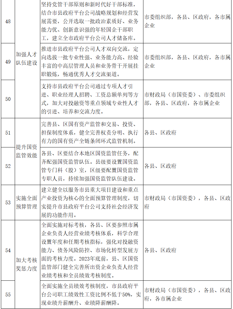18.加強人才隊伍建設(shè)。堅持黨管干部原則和新時代好干部標準,結(jié)合市縣政府平臺公司戰(zhàn)略規(guī)劃和經(jīng)營發(fā)展需要,公開選取一批政治素質(zhì)好、業(yè)務(wù)能力優(yōu)、創(chuàng)新意識強的年輕國企干部職工,建立全市政府平臺公司人才儲備庫。推進市縣政府平臺公司人才雙向交流,定向選拔一批專業(yè)性強、業(yè)務(wù)能力高、經(jīng)驗豐富的中高層管理人員和業(yè)務(wù)骨干開展掛職鍛煉,暢通優(yōu)秀人才交流渠道。支持市縣政府平臺公司通過專項人才引進、職業(yè)經(jīng)理人招聘、工資總額單列等方式,加大對投融資等重點領(lǐng)域?qū)I(yè)性人才的引進、培養(yǎng)和交流力度。〔責任單位:市委組織部、市財政局(市國資委),各縣、區(qū)政府,各市屬企業(yè)〕