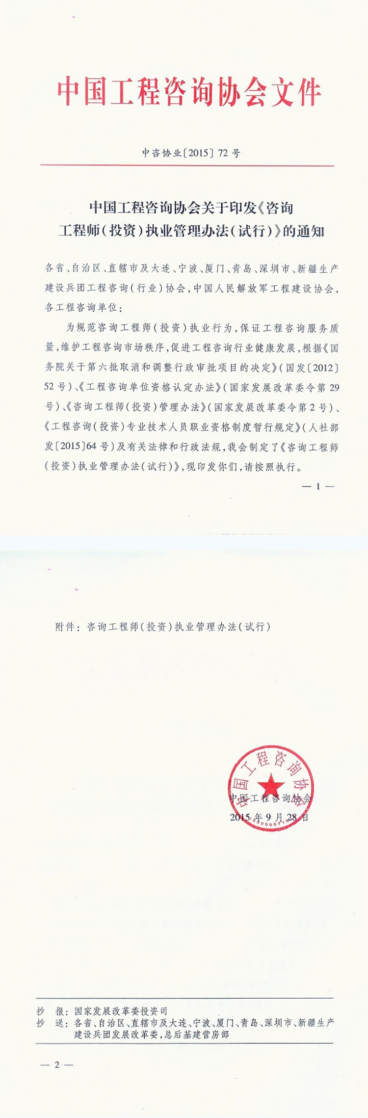 第四條 中國工程咨詢協(xié)會(以下簡稱“中咨協(xié)會”)是全國工程咨詢行業(yè)的自律組織,負責管理咨詢工程師(投資)及工程咨詢單位與咨詢工程師(投資)相關事項的執(zhí)業(yè)行為。
