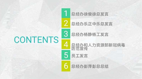 本次會(huì)議由人力資源部譚蓉主持,每位同事從自己的生活狀態(tài)到對(duì)工作的匯報(bào)和對(duì)戰(zhàn)勝疫情的決心中娓娓而談,閑話家談中表達(dá)出自己對(duì)未來(lái)生活的美好祝愿。